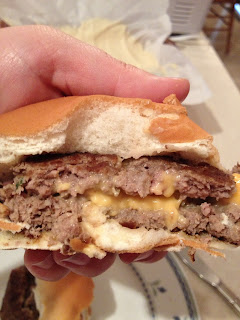 The burgers aren't simple to put together, but the tips we found to work best was making two thin patties, fold a slice of cheese in fourths and place it on the center. Then place one patty on top of the other, press down on the edges with the burgers sandwiched between two pieces of wax paper. Make sure the patties are thin enough to cook through stacked, but thick enough to not leave cracks where cheese will inevitably leak out when melted.